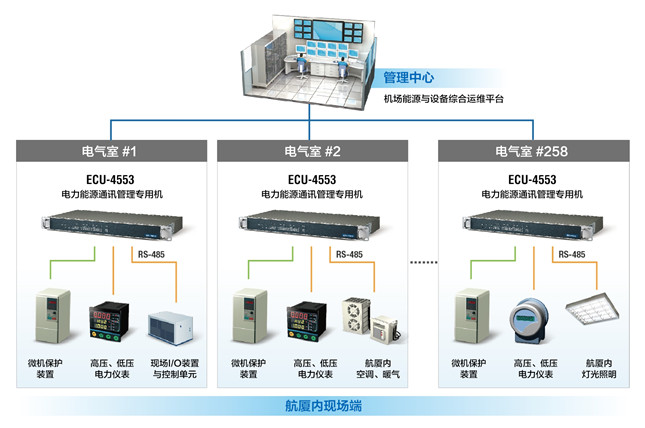 在配置有258間電氣室的北京新機場,每一間都裝設(shè)一臺研華ECU-4553作為數(shù)據(jù)網(wǎng)關(guān),即可滿足此項目串連大量、多樣底層設(shè)備與上層管理系統(tǒng)的需求。通過這臺電力能源通訊管理機提供的串口連接微機保護裝置、高壓/低壓電力儀表、現(xiàn)場I/O裝置、現(xiàn)場控制單元等裝置,并在其高速運算處理下完成采集數(shù)據(jù)的通訊協(xié)議轉(zhuǎn)換,大量數(shù)據(jù)就能通過以太網(wǎng)絡(luò)端口連接的交換機傳送至位于監(jiān)控中心的管理系統(tǒng)。