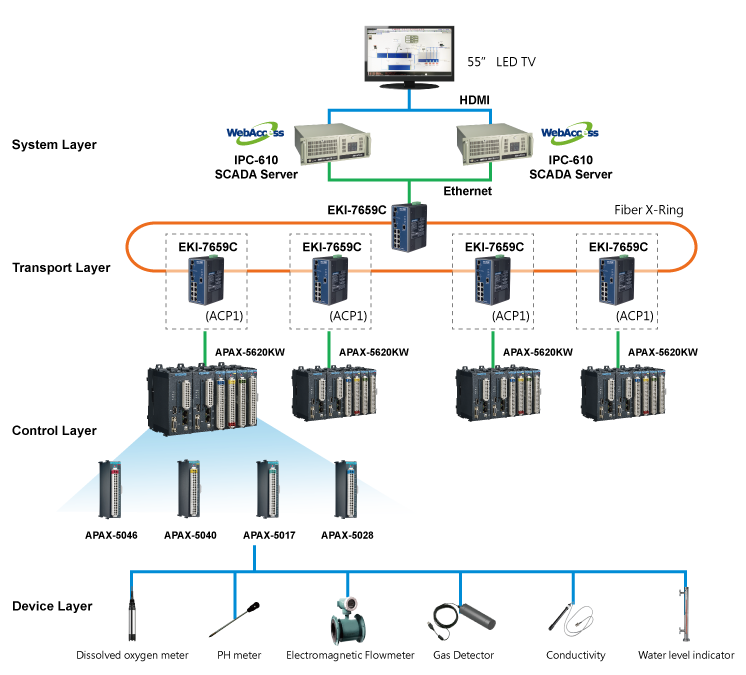 ?廢水處理廠是現(xiàn)代社會的基本基礎(chǔ)設(shè)施,用于凈化家庭和企業(yè)產(chǎn)生的廢水。它的一天24小時不間斷運行,廢水處理包括多個過程,以去除固體,有機化合物和其他物質(zhì)。這樣復雜的工作流程需要仔細的管理,僅由工廠人員監(jiān)督是不夠的。此外,水源水質(zhì)可即時改變,任何疏忽或失誤都可能導致處理不當或造成環(huán)境污染。因此,自動監(jiān)測和控制系統(tǒng)在確保處理后的廢水排入下水道或河流之前,要滿足環(huán)境法規(guī)和政府標準,一直發(fā)揮著非常重要的作用。 但是,如何以最小的成本有效地創(chuàng)建集中的監(jiān)控管理系統(tǒng)以獲得最大的價值,如何確保系統(tǒng)的穩(wěn)定性并保留將來的擴展能力,所有這些都會受到硬件和軟件選擇的影響。研華提供功能強大的軟件和廣泛的硬件產(chǎn)品組合,包括先進的WebAccess SCADA軟件,帶有I / O模塊的APAX可編程自動化控制器和EKI以太網(wǎng)交換機,使系統(tǒng)集成商可以通過一站式購買快速完成廢水處理廠項目,而不必擔心兼容性。通過提供完全冗余的功能,該整體解決方案具有最大的可靠性,可以確保不間斷運行。與此同時WebAccess強大而豐富的功能使開發(fā)人員能夠輕松獲取數(shù)據(jù),并集成多個節(jié)點或平臺,以滿足項目當前和未來的需求,同時降低開發(fā)和維護成本。