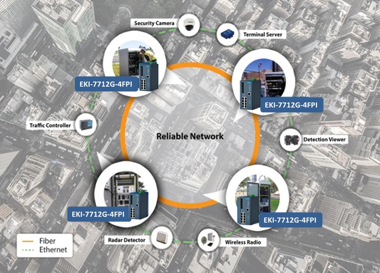 EKI-7712G-4FPI支持具有240 W PSE功能的完整PoE +,非常適合為交通攝像頭和無(wú)線(xiàn)電供電和連接。