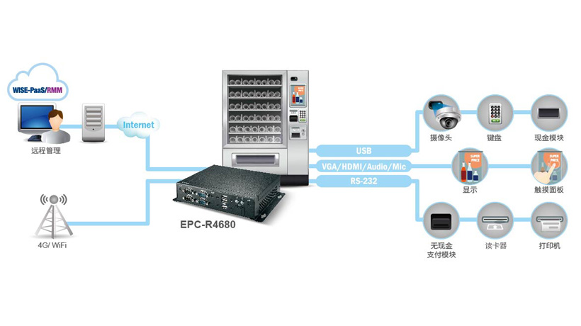 ▌▌研華方案研華提供了EPC-R4680精簡型工控機作為方案,該方案搭載Rockchip ARM Cortex-A17 RK3288 Quad core高性能處理器,穩(wěn)定可靠。同時支持4K 顯示及 4Kx2K多格式HDMI視頻解碼。此外,配有M.2, Mini-PCIe 及支持WIFI的SIM卡卡槽、支持BT及4G連接,6 USB 2.0, 6UART, 1 GbE 及 8 GPIO的豐富接口,是KIOSK、販賣機及數(shù)字標(biāo)牌應(yīng)用的理想解決方案。同時,1U的小尺寸,滿足客戶緊湊型需求。