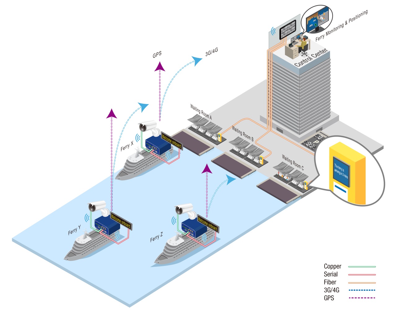 該過程概述如下: 1.將研華的蜂窩路由器放置在每艘渡輪上,并與PoE攝像機和顯示系統(tǒng)硬連接 2.蜂窩路由器收集數(shù)據(jù),以通過3G / 4G運營商空中傳輸?shù)娇刂浦行暮兔總€碼頭的自助服務(wù)終端。 3.蜂窩路由器還具有GPS功能,可實現(xiàn)實時定位。 4.控制中心負責監(jiān)視多個渡輪,從每個渡輪上的蜂窩路由器接收機載和位置信息,將原始數(shù)據(jù)轉(zhuǎn)換為有意義的乘客信息,然后通過光纖連接將其發(fā)送到每個碼頭。 5.每個碼頭都安裝了旅客信息亭,以通過儀表板顯示實時渡輪位置和登機信息。 ▌▌產(chǎn)品信息