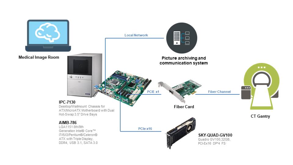 AIMB-786工業(yè)ATX主板支持多個通信接口和擴展插槽,例如LAN和光纖網(wǎng)卡,用于與圖片存檔和通信系統(tǒng)(PACS)連接。同時,SKY-QUAD-GV100 NVIDIA Quadro GPU卡使用Turing™GPU架構(gòu),與上一代圖形卡相比,性能提高了六倍。